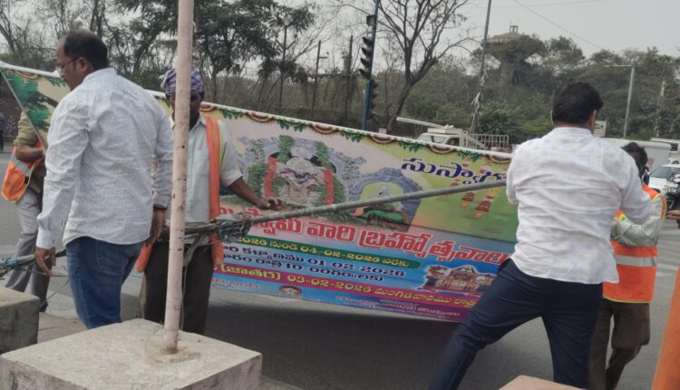 ఫ్లెక్సీల తొలగింపు వరకు అంతా బాగానే ఉన్నా… ఓ పక్క జిహెచ్ఎంసి సిబ్బంది ఫ్లెక్సీలను తొలగిస్తున్నట్లు కనిపిస్తున్న… అదేమీ వారికి పట్టనట్లు కూడలిలోని రోడ్డుకు మరోవైపు అంబేద్కర్ విగ్రహం వద్ద నూతన ఫ్లెక్సీలను ఏర్పాటు చేయడం వారి నిర్లక్ష్య ధోరణికి అద్దం పడుతుంది. సిబ్బంది వారిని వారిస్తున్న తమకు ఫ్లెక్సీ కట్టేందుకు అనుమతి ఉందంటూ బుకాయిస్తూ ఓ ఆసుపత్రి ప్రారంభోత్సవానికి చెందిన ఫ్లెక్సీలు కట్టడం వారి నిర్లక్ష్యానికి పరాకాష్టగా నిలిచింది. మరి నిబంధనలకు విరుద్ధంగా, సిబ్బంది చెప్పిన వినకుండా ఫ్లెక్సీ కట్టిన వారిపై అధికారులు ఏ మేరకు జరిమానా విధించి, చర్యలు తీసుకుంటారో వేచి చూడాల్సిందే. అనంతరం సదరు ఫ్లెక్సీని సిబ్బంది తొలగించారు.