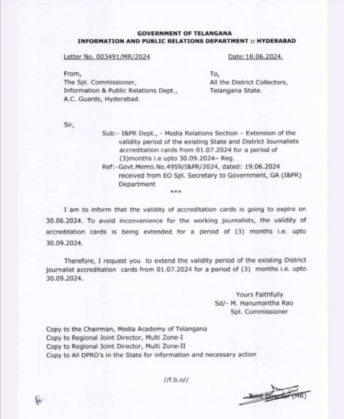 కుత్బుల్లాపూర్ (న్యూస్ విధాత్రి), జూన్ 19 : తెలంగాణ రాష్ట్రంలో విలేకరులుగా విధులు నిర్వహిస్తున్న వర్కింగ్ జర్నలిస్టుల మీడియా అక్రిడిటేషన్ కార్డుల గడువును మరో మూడు నెలలు పొడిగిస్తూ సమాచార, పౌర సంబంధాల శాఖ ప్రత్యేక కమిషనర్ ఎం. హనుమంతరావు ఉత్తర్వులు జారీ చేశారు.